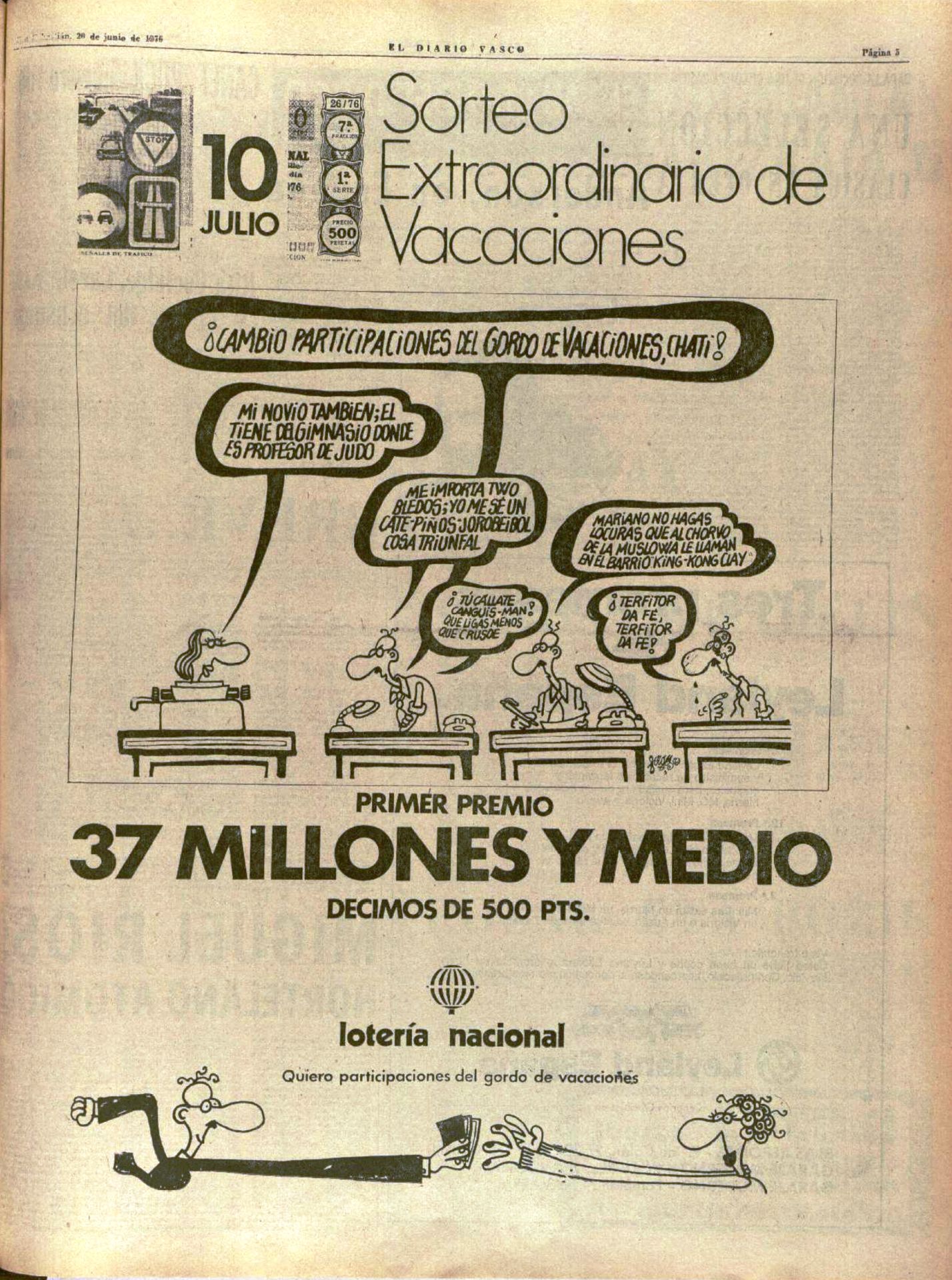 Un año más tarde, otro destacado dibujante y humorista, Forges, haría publicidad de lotería con sus inolvidables oficinistas. La encontramos en la edición de DV del 20 de junio de 1976…