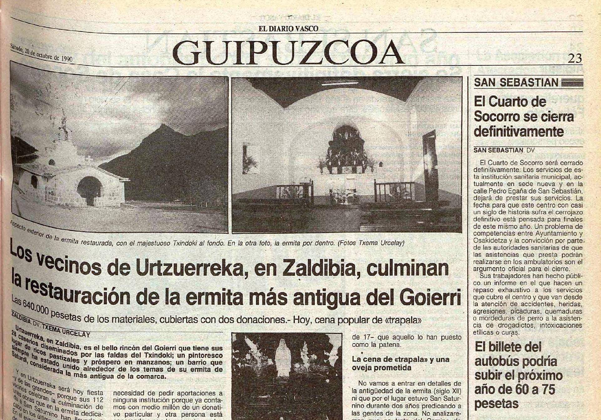La fórmula del 'auzolan', es decir, la realización colectiva y desinteresada por parte del vecindario de determinadas obras de interés común, fue muy habitual en ... nuestra Gipuzkoa. La encontramos bien explicada en un caso concreto, la restauración de la ermita de San Saturnino en Urtzuerreka, un barrio de caseríos diseminados de Zaldibia que entonces, en 1990, contaba con 112 habitantes.