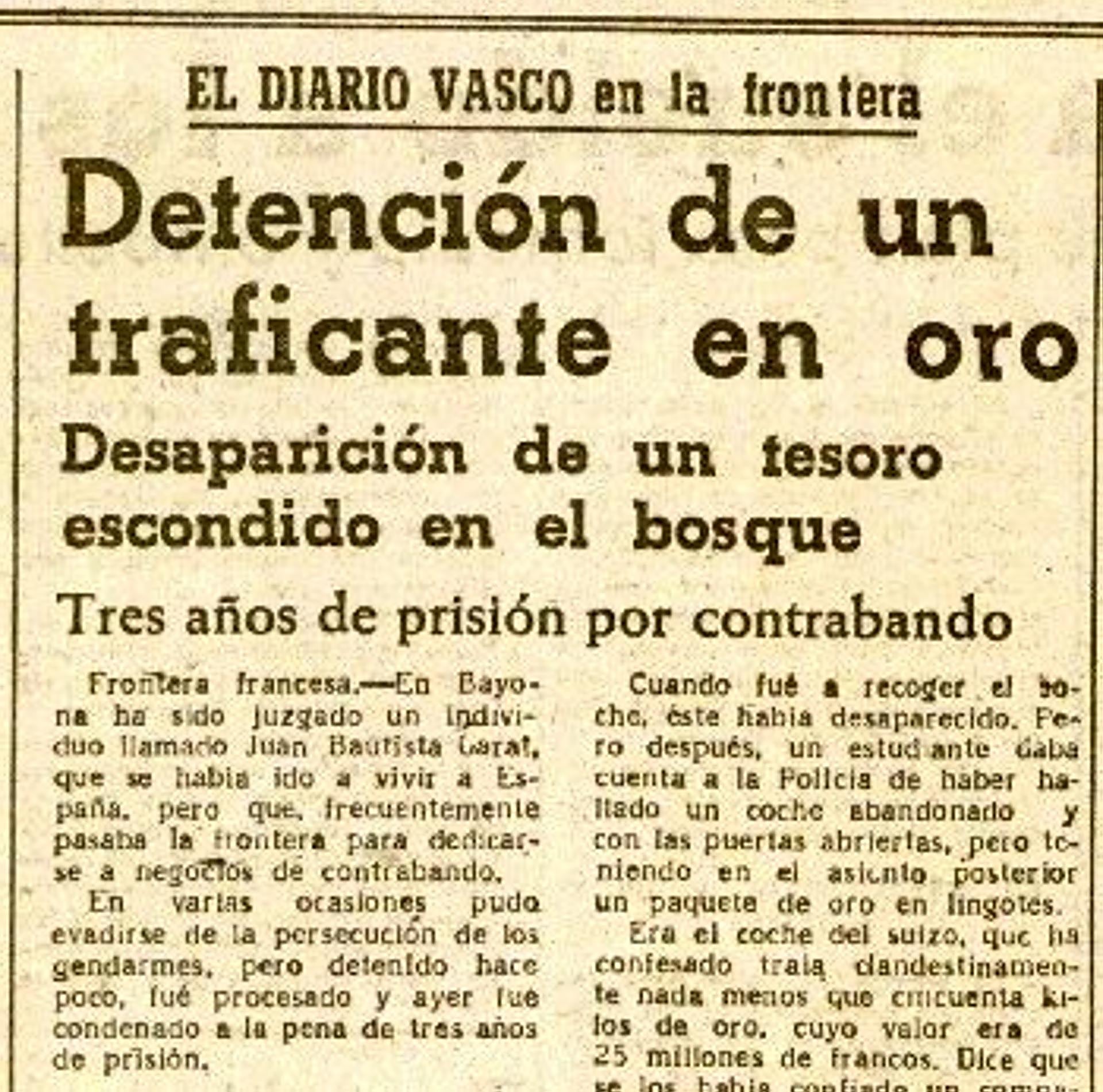Cambiamos de lugar (a la frontera irunesa) y año (1950) pero no de día. El 2 de diciembre de 1950 escribía José María Goitia en DV sobre un contrabandista que no había despertado sospechas pese a que «frecuentemente pasaba la frontera para dedicarse a negocios de contrabando». Hasta que, no se explicaban las circunstancias, los gendarmes le detuvieron y fue condenado en Baiona a tres años de prisión.