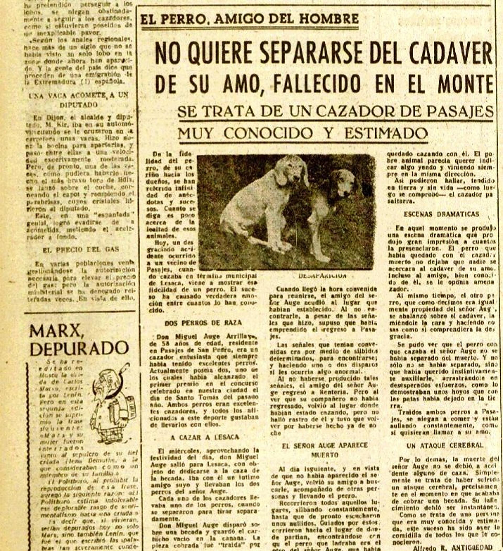 Nos fijamos hoy en una pequeña noticia de la que se habló mucho hace 74 años. Sus protagonistas, un cazador pasaitarra «muy conocido y estimado», que falleció por un ataque cerebral mientras cazaba, y un perro que, fiel a su instinto, no quiso separarse del cuerpo de su amo.