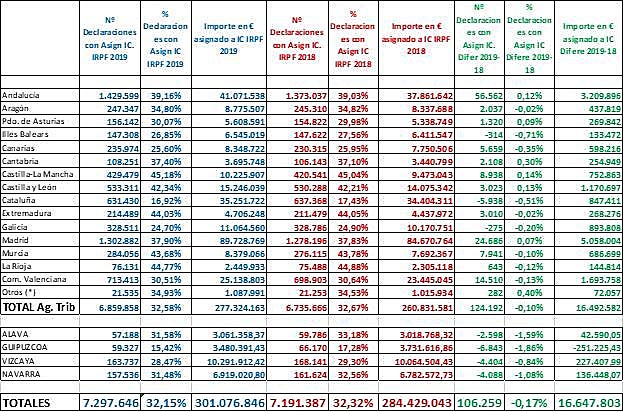 Los mayores aumentos en asignaciones tributarias se produjeron en Madrid, Andalucía y Castilla y León con 5 millones, 3,2 y 1,1 millones. En relación a las cantidades, en la declaración de 2019 la cantidad destinada por los contribuyentes a la Iglesia católica aumenta en 16,6 millones y alcanza los 301 millones de euros, un incremento del 5,85% con respecto al año anterior, lo que permitirá una ayuda «más eficaz a las personas que más lo necesitan», según destaca en una nota la CEE.
