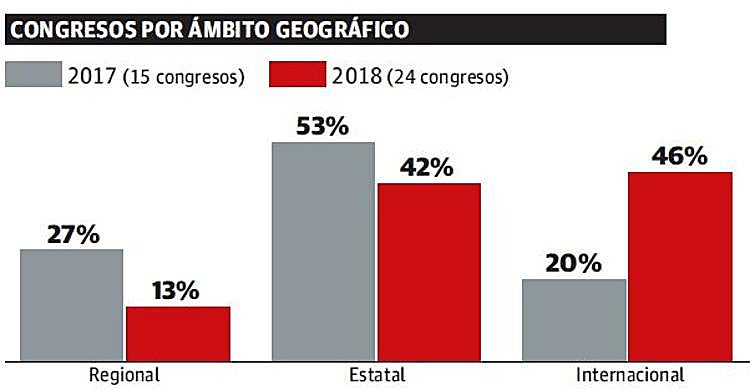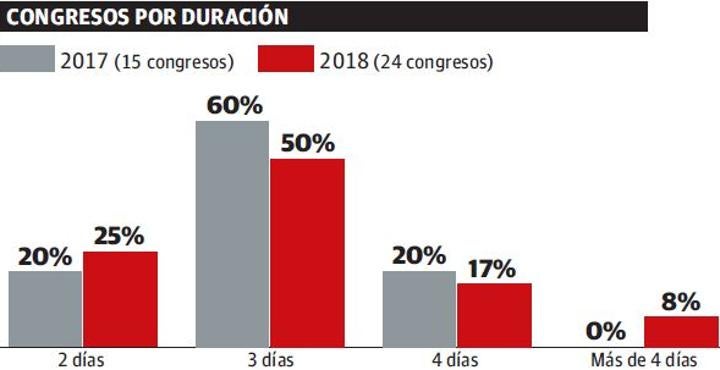 Este brillante balance de 2018 se sustenta en la convergencia de fuertes crecimientos en segmentos claves como el cultural, los eventos y los congresos, los cuales casi la mitad (46%) tuvieron un perfil internacional. Uno de los hitos en la actividad congresual del año pasado fue la 108 Reunión del Consejo Ejecutivo de la Organización Mundial del Turismo (OMT) o el encuentro del grupo ALDE del Parlamento Europeo. Entre las reuniones profesionales destacan el 13th European Molecular Imaging Meeting así como el XII Congreso de Cardiología Pediátrica, Graphene Week o la Conference European Association for Terminology.