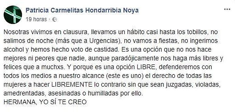 'Nosotras vivimos en clausura, llevamos un hábito casi hasta los tobillos, no salimos de noche (más que a urgencias), no vamos a fiestas, no ingerimos alcohol y hemos hecho votos de castidad. Es una opción que no nos hace mejores ni peores que nadie, aunque paradójicamente nos haga más libres y felices que a muchas. Y porque es una opción LIBRE, defenderemos con todos los medios a nuestro alcance (este es uno) el derecho de todas las mujeres a hacer LIBREMENTE lo contrario sin que sean juzgadas, violadas, amedrentadas, asesinadas o humilladas por ello. HERMANA, YO SÍ TE CREO«.