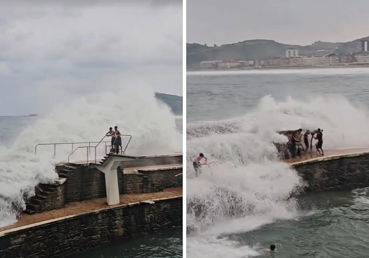 Tal y como muestra el vídeo del usuario 'rekadista_txatarrista' en redes socailes, varios jóvenes se han animado a asistir en primera línea las olas que azotan el puerto de Zarautz. Los gritos de advertencia parecen no calar en los bañistas que están en el agua, ya que aprovechan las olas para hacer surf, o para nadar entre ellas. Y todo, sin caer en la cuenta de que las olas, que han vencido el muro del muelle, podrían haber zarandeado o arrastrado a alguno de los bañistas, con la consiguiente lesión. Una imprudencia en toda regla.
