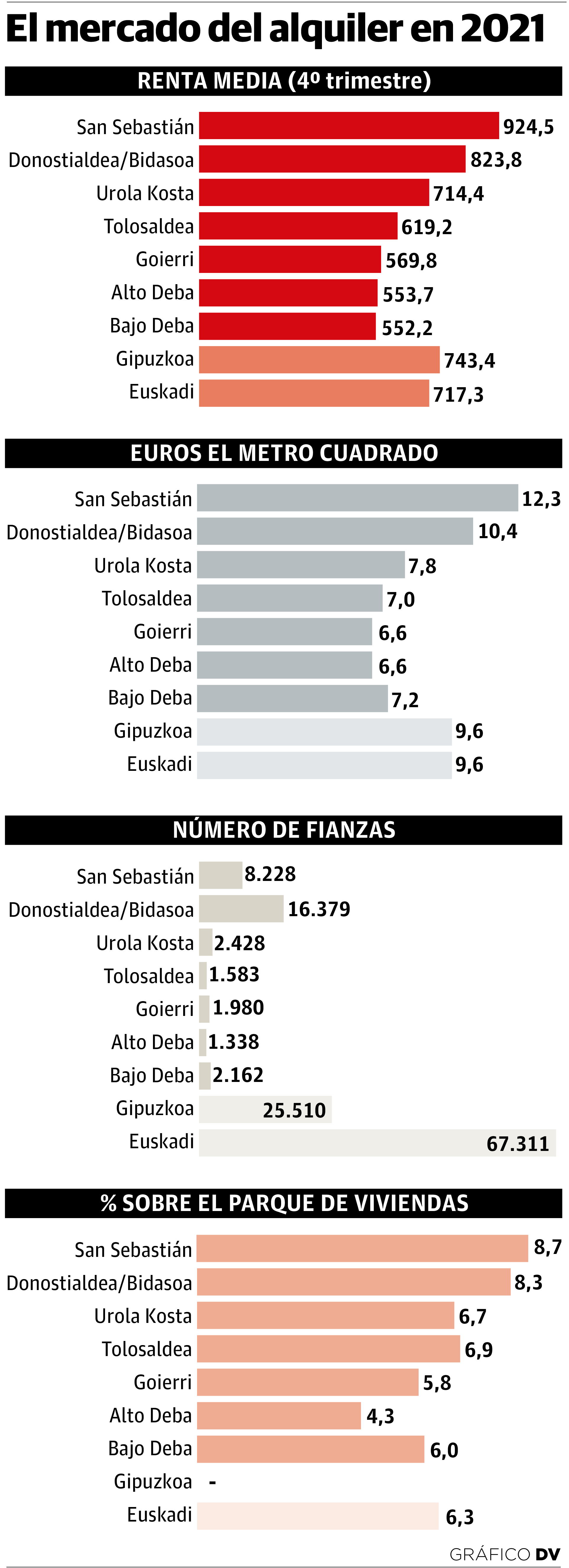 El incremento en el precio de los alquileres en Gipuzkoa no da tregua. A finales del año pasado la renta media ascendía ya a ... 743,4 euros, tras subir un 2,1% en doce meses. Medido en función de la superficie, el coste es de 9,6 euros por metro cuadrado, un 2% más. Obvia decir que San Sebastián sigue siendo la localidad más cara para vivir. El arrendamiento promedio alcanza en la capital los 924,5 euros, a 12,3 euros por metro cuadrado. Es la ciudad con las tarifas más elevadas de Euskadi, y Gipuzkoa el territorio donde el esfuerzo a hacer es mayor. En Álava el alquiler medio es de 660,3 euros y en Bizkaia de 708,9, para una media vasca de 717,3. En las capitales, establecerse en Vitoria supone tener que desembolsar 690,1 euros al mes; y en Bilbao, 778,4.