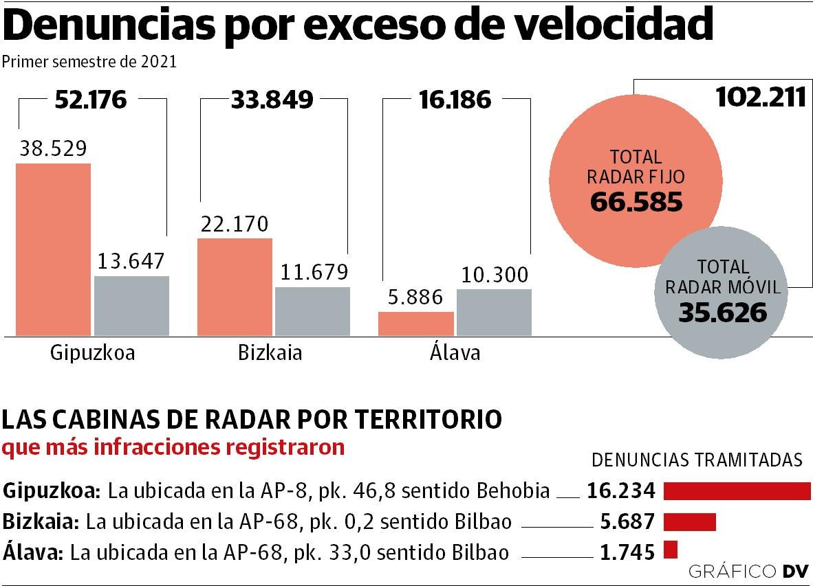 Para que se hagan a la idea, esas 16.200 denuncias por exceso de velocidad de enero a junio son más de las que se han registrado en todo el territorio de Álava y prácticamente la mitad de las de Bizkaia –ver gráfico adjunto–, cuya red de carreteras acoge a muchos más vehículos –Bizkaia cuenta con una población de 1,1 millones frente a los 700.000 de Gipuzkoa–.
