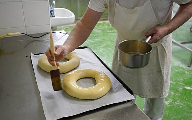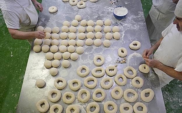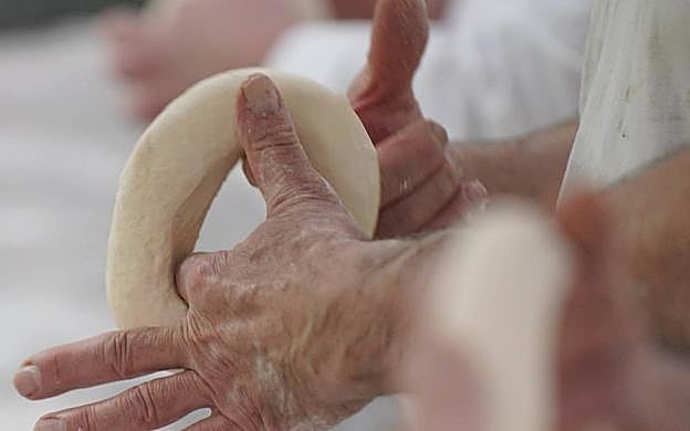 Hacer un agujero en el centro hundiendo un dedo en la masa para darle la forma delrosco. Darle vueltas a la masa agarrando por el agujero.