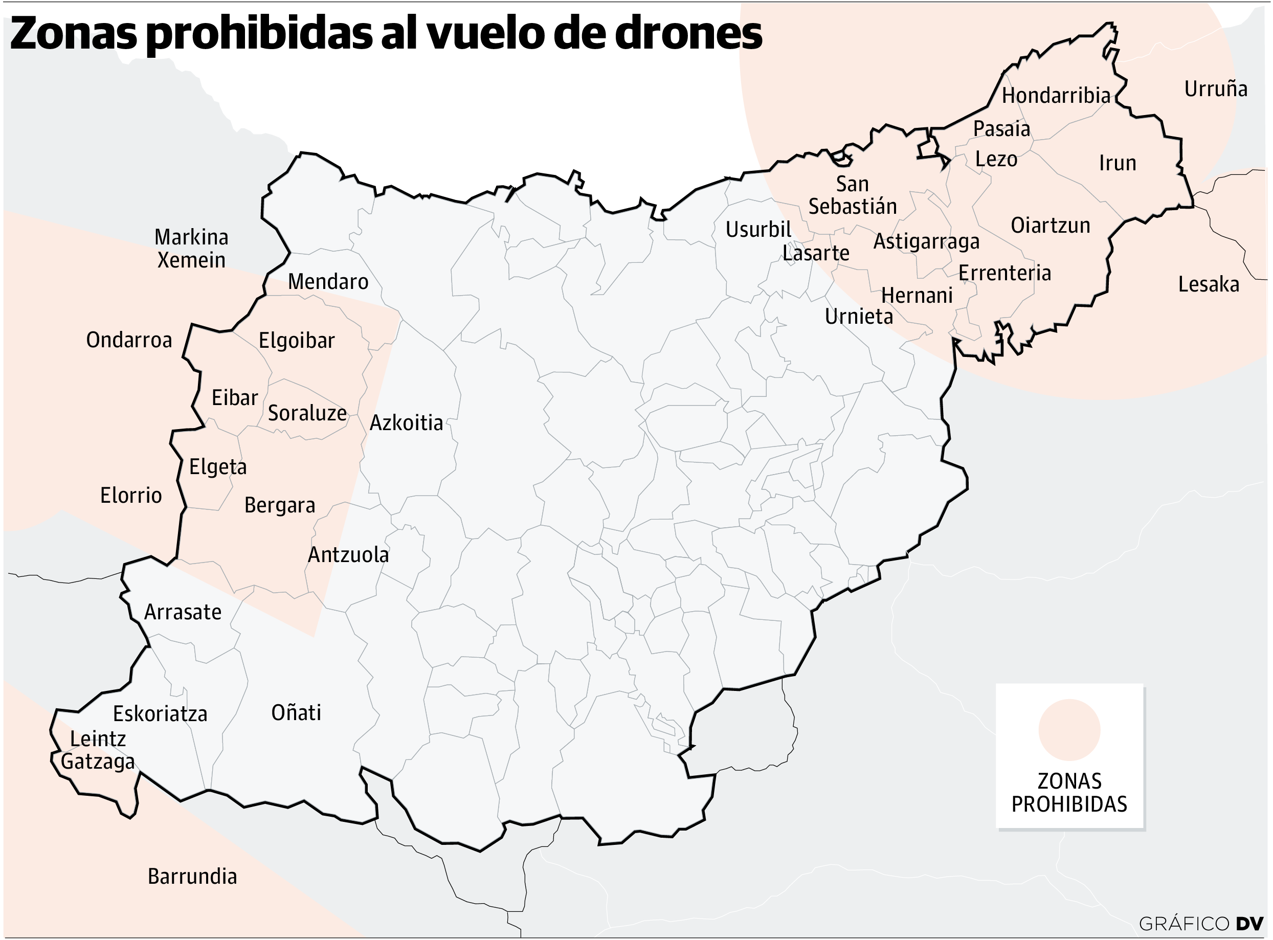 Todas las actividades deportivas, recreativas, de competición y exhibición, así como las lúdicas propias de las aeronaves de juguete, tienen que respetar unas condiciones de uso del espacio aéreo que el aeropuerto de Hondarribia limita por el este de Gipuzkoa y el de Loiu por el oeste. La prohibición de despegar uno de estos aparatos a menos de 20 kilómetros de distancia de un aeródromo, junto al impedimento de hacer volar un dron a más de 120 metros de altura y 500 de distancia, ni sobre aglomeraciones de edificios ni de personas, limita el espacio aéreo guipuzcoano a escasas zonas rurales. No en vano, Enaire, el gestor de navegación aérea en España, dispone en su página web (https://drones.enaire.es/) de un mapa interactivo donde se pueden consultar las áreas libres de circulación.