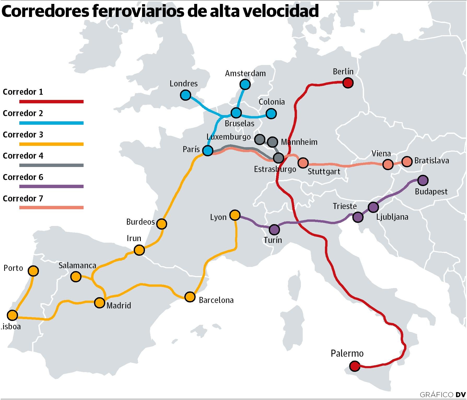 La Unión Europea tiene definidos siete corredores estratégicos de alta velocidad a lo largo de todo el continente dentro de un mapa ferroviario transeuropeo más amplio. La 'Y vasca' forma parte del tercer eje, el del Sur de Europa, que, con diferentes ramales, está compuesto a su vez por el trazado Atlántico (Lisboa-Madrid-Irun-París) y el Mediterráneo.