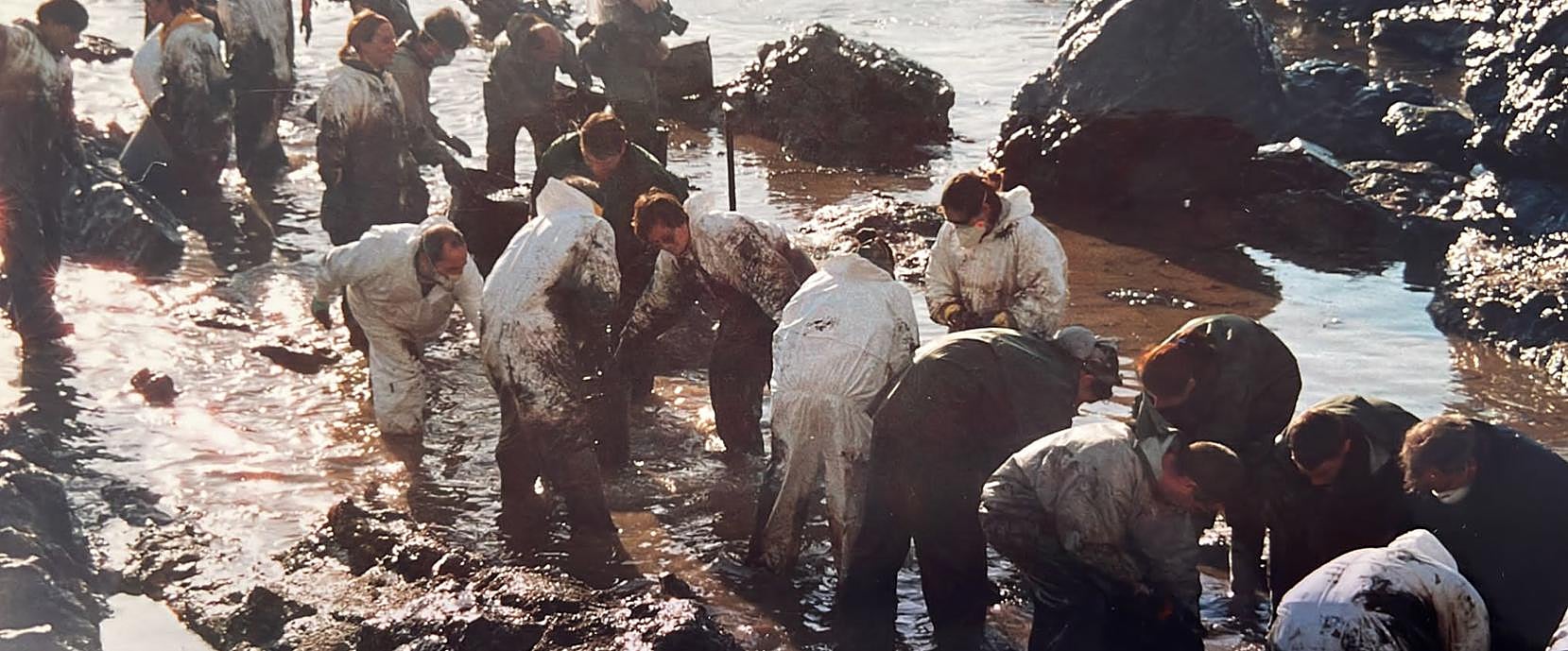 Voluntarios guipuzcoanos que viajaron hasta Galicia para colaborar en las tareas de limpieza del vertido del 'Prestige' rememoran aquellos días de buzo y chapapote 20 años después de la tragedia