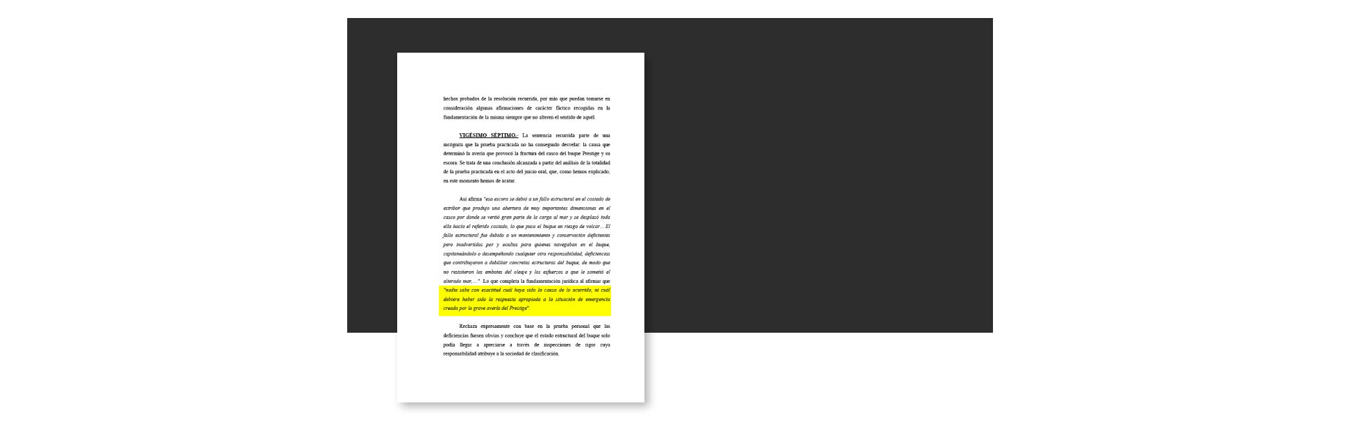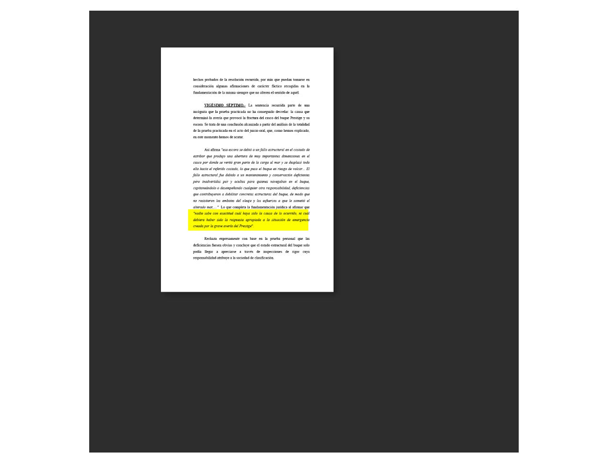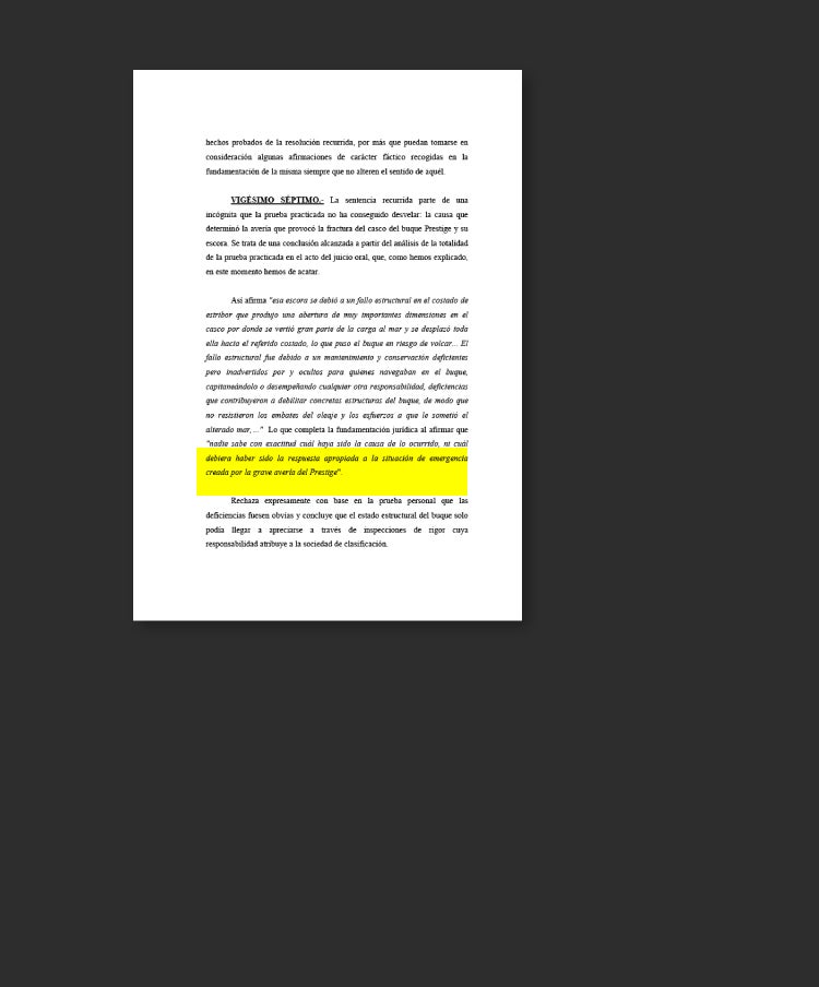 “Nadie sabe con exactitud cuál ha sido la causa de lo ocurrido, ni cuál debiera haber sido la respuesta apropiada a la situación de emergencia creada por la grave avería del Prestige”.