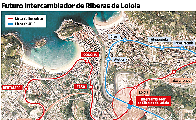 El intercambiador ferroviario de Riberas de Loiola, la estación que actuará como punto de enlace de las líneas de Euskotren (Topo) y Renfe (Cercanías) en las afueras de San Sebastián, acaba de dar un paso de gigante para hacerse realidad. La Diputación de Gipuzkoa, el Gobierno Vasco y Adif, la empresa pública encargada de la gestión de las infraestructuras ferroviarias estatales, acaban de firmar hace escasos días el convenio para la financiación y construcción del futuro nudo de comunicaciones, lo que en la práctica supone el pistoletazo de salida para ejecutar el proyecto. En virtud del acuerdo, las tres instituciones asumirán a partes iguales el coste de la obra, presupuestada en 35,9 millones de euros más IVA (39,4 millones en total), a razón de 11,5 millones cada una, más 1,2 que se obtendrán por las tasas de dirección de obra.