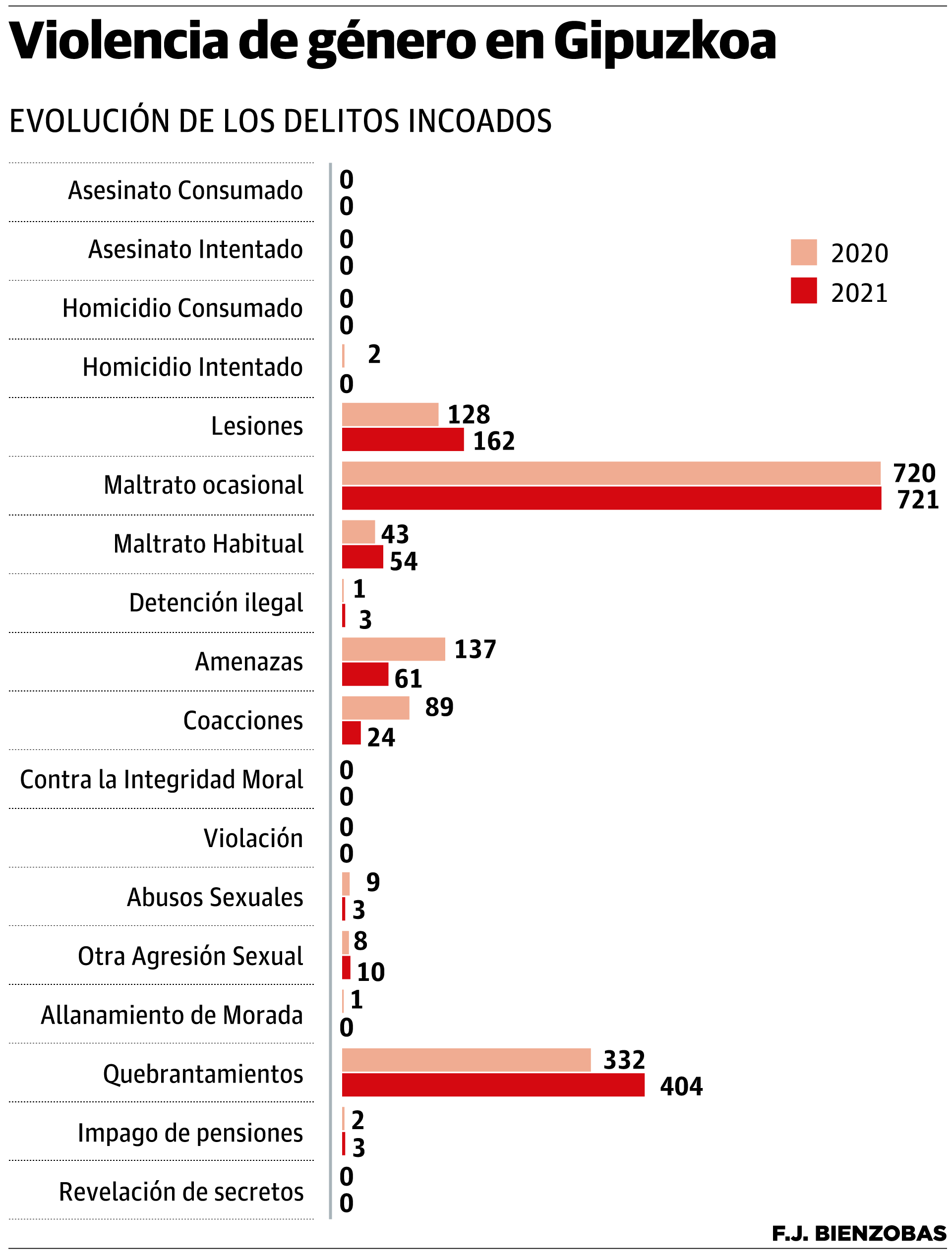 21% Un 21% aumentaron los delitos por quebrantamientos de las penas impuestas a condenados por violencia de género en Gipuzkoa durante el año pasado. Suelen ser medidas de alejamiento o comunicación.