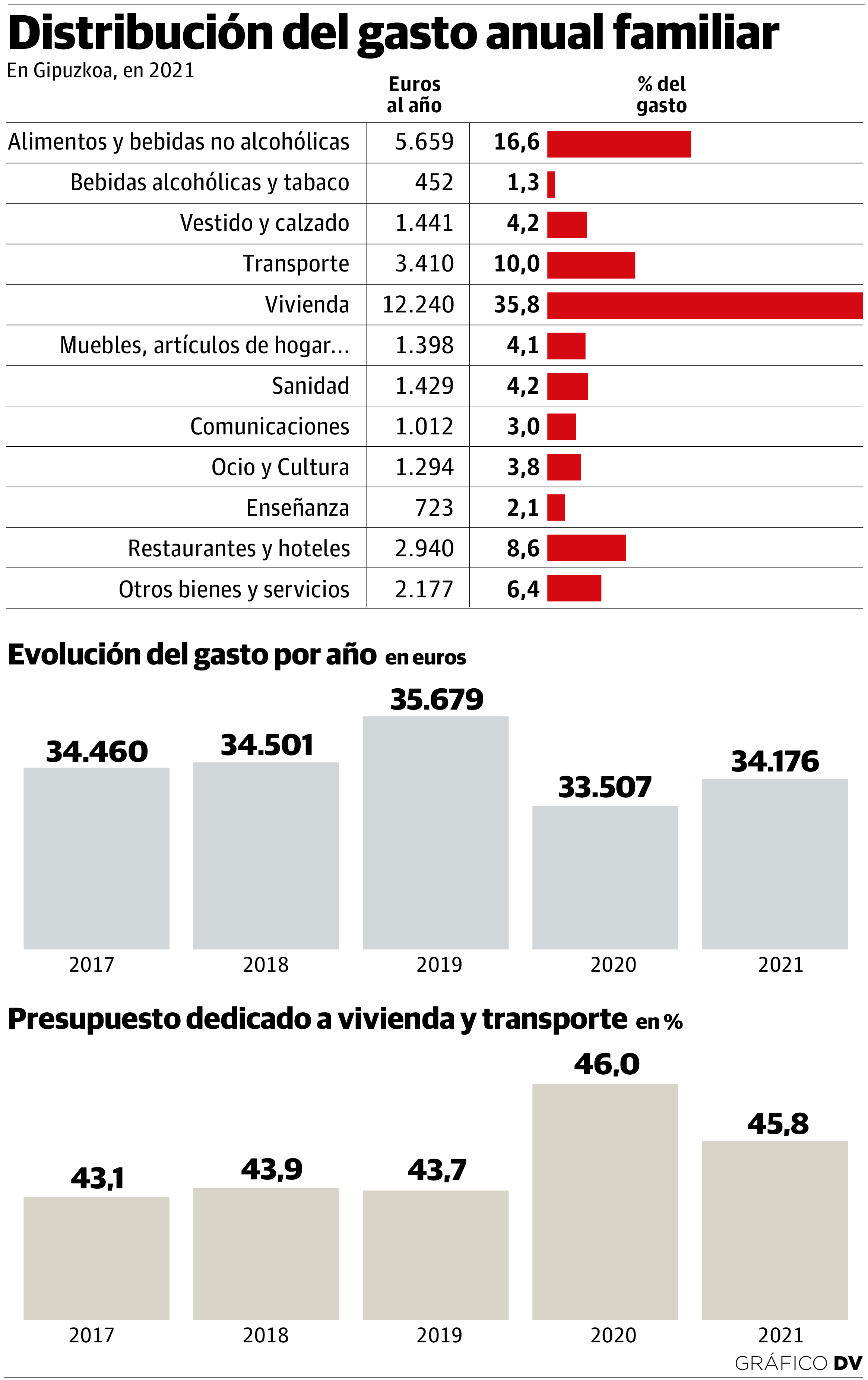 Según los resultados de la Encuesta de Gasto Familiar en 2021 que este martes publicó el Instituto Vasco de Estadística (Eustat), estas dos variables consumían el año pasado el 45,8% de los recursos que los hogares guipuzcoanos destinaron a la compra de bienes y servicios. Desglosado por epígrafes, Vivienda se comía el 35,8% de los recursos, en tanto que Transporte supuso el 10%. Pero el escenario ha cambiado sustancialmente en este 2022, sobre todo por el repunte de los combustibles.
