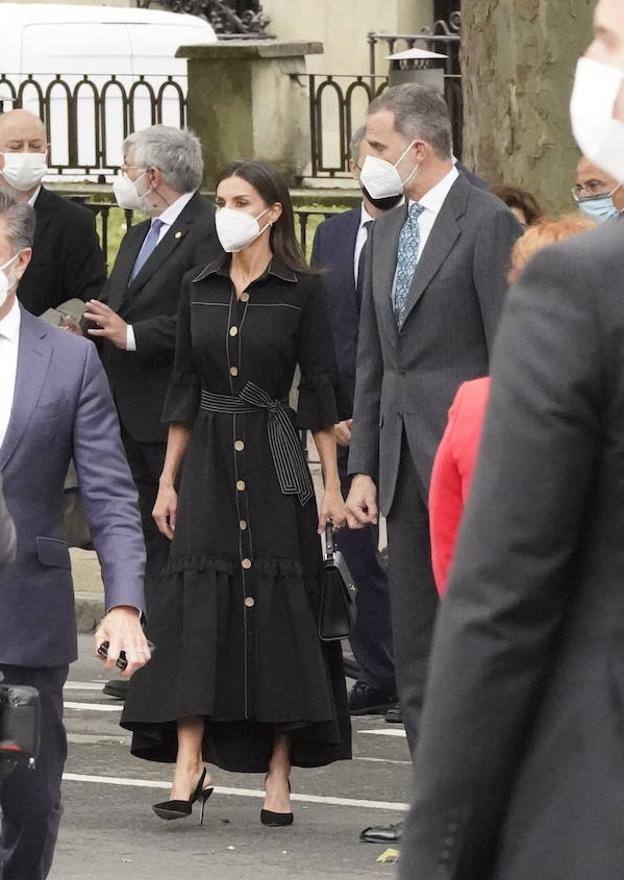 Los eventos de primavera se reactivan progresivamente. En cuestión de estilo, las firmas de moda proponen como única premisa vestir a todo color para olvidar este año gris, algo que doña Letizia ha seguido a rajatabla en los últimos actos oficiales. A mediados de mayo recuperó un conjunto asimétrico de Zara en un vibrante naranja, mientras que este mismo martes estrenó un vestido-blazer en rosa sorbete del que aún se desconoce su procedencia. Sin embargo, cuando quiere distraer el foco de atención, abandona los tonos vitamina y recurre a piezas discretas en colores básicos, como ocurrió el sábado en la confirmación de la princesa Leonor. Hoy, en un acto que requiere sobriedad, la Reina ha cambiado completamente de registro, apostando por el siempre acertado negro. Además, ha hecho honor a la tierra, estrenando un diseño de la vizcaína Leyre Doueil.