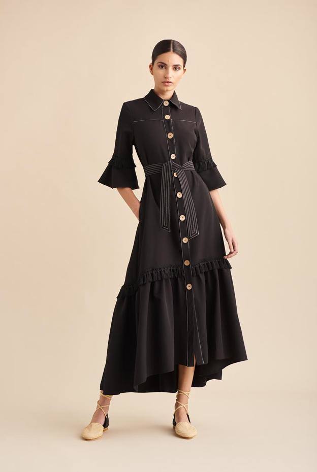Se trata de un vestido camisero con toques de tendencia en sus acabados, que pertenece a la nueva colección, bautizada con el nombre de 'Raízes'. Es un diseño con manga tres cuartos rematada con volante y tiene una largura 'midi' ligeramente asimétrica, más corta por delante y larga por detrás. Además, está ribeteado en beige, tiene botonadura en contraste e incorpora un cinturón que introduce cierto toque étnico al conjunto. Un accesorio muy a tener en cuenta para este verano en el que los diseñadores lo proponen, sobre todo, con vestidos largos, holgados y tipo caftán o túnica.