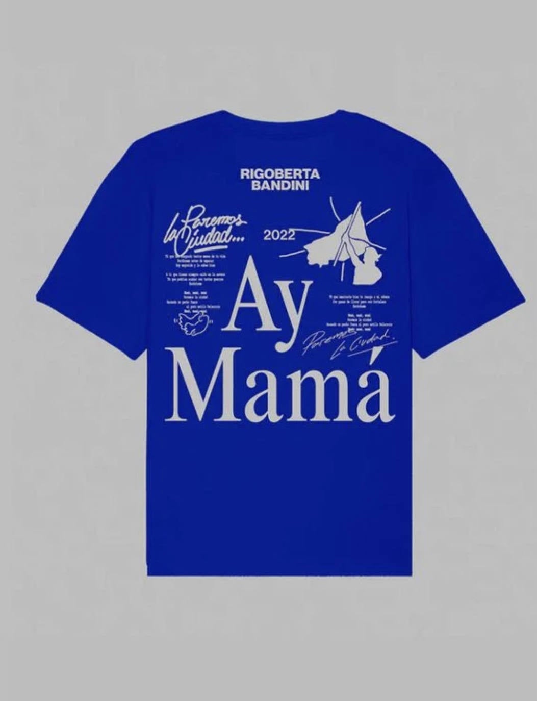La cantante se ha estrenado con dos camisetas producidas en algodón 100% orgánico. La primera de ellas, un modelo de manga corta blanco con el 'Ay mamá' y algunas de las principales frases de la icónica canción en azul; y la otra, con base azul klein con el 'print' en blanco a contraste.