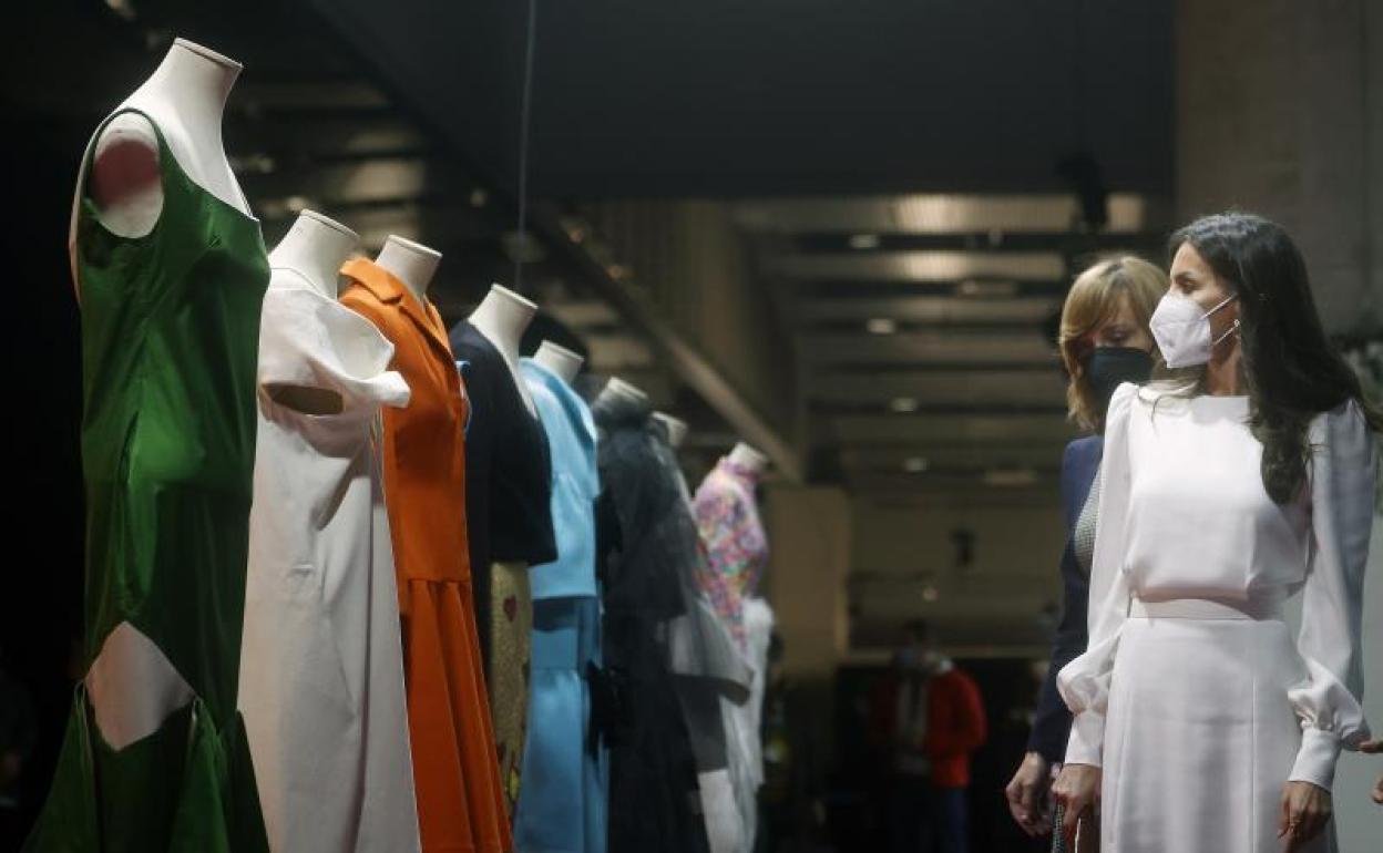 La Reina contempla alguno de los diseños de archivo expuestos en Ifema. EP