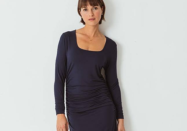 Vestido ajustado largo hecho con Tencel 'stretch' muy suave que lleva un cuello cuadrado, un efecto plisado en la cintura y en los puños. Nos gusta y encaja esta opción porque es azul marino. Las fibras de 'Tencel' proceden de bosques gestionados de forma sostenible. Un fondo de armario perfecto para cualquier estación.