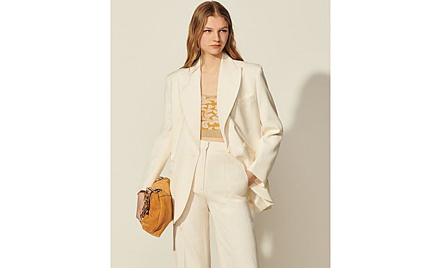El binomio de pantalón y blazer en blanco nuclear se ha convertido en sinónimo de estilo y clase. Si buscas sumarte a la tendencia monocromática, la blazer está a la venta por 345€ y el pantalón por 157,5€.