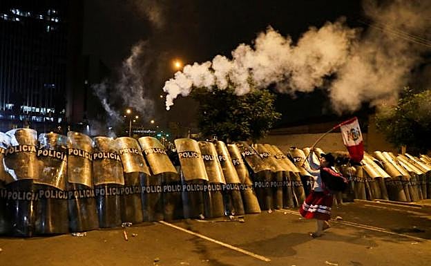 Manifestantes arremeten contra el bloqueo que hace la Policía para frenar su avanzada en Lima reuters