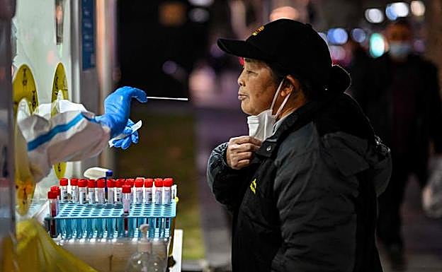 Un sanitario realiza a través de una pantalla protectora una prueba PCR a un ciudadano en Shanghái. EFE