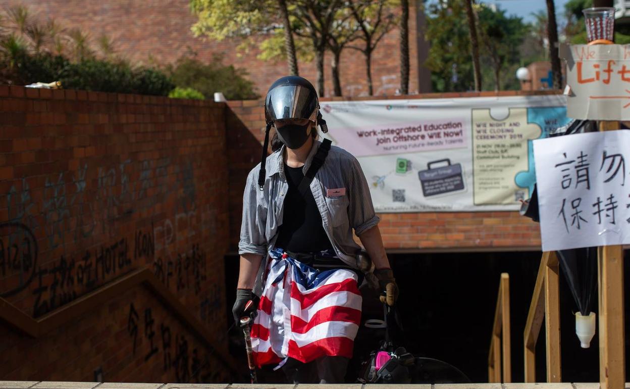 Un manifestante sale de la cafetería de la Universidad Politécnica de Hong Kong con una bandera de EE UU anudada a la cintura. EFE