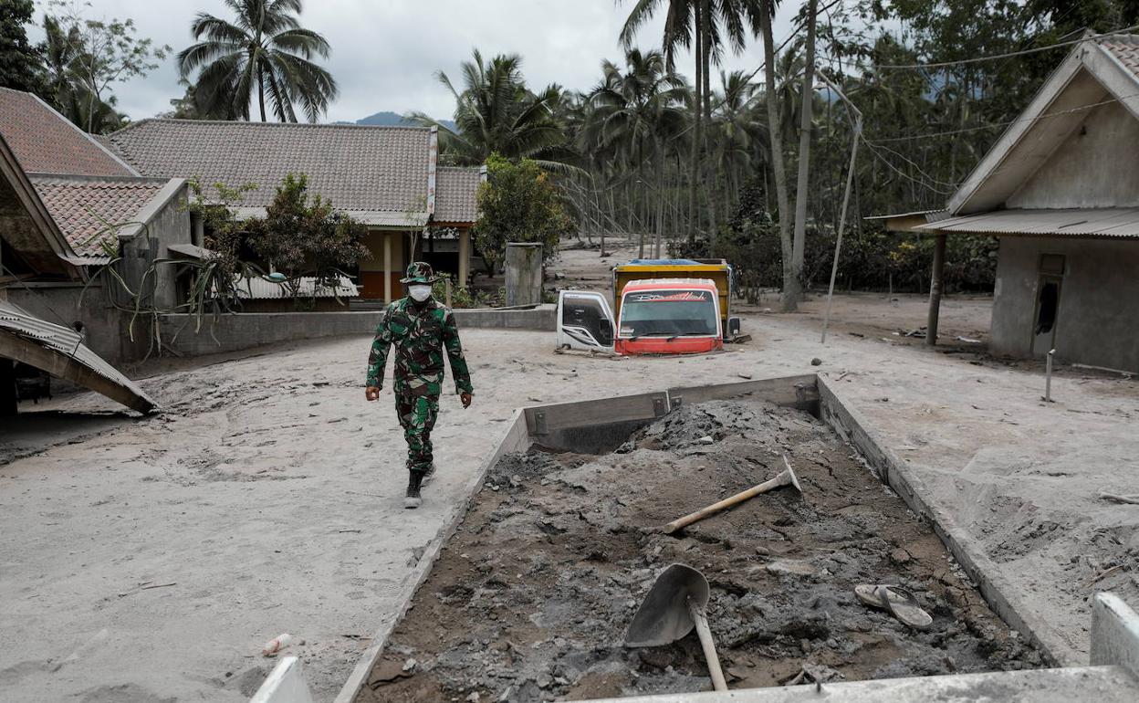 El volcán Semeru dejó al menos once pueblos del distrito de Lumajang cubiertos de ceniza. Sepultó casas, acabó con la vida de ganado y forzó a 1.300 personas a cobijarse en mezquitas, escuelas y otros edificios públicos. Una escena desoladora. Padres con hijos traumatizados, familias con colchones a cuestas, agricultores con sus cabras en brazos, vivas de milagro... Tras la erupción, los nativos están conmocionados en una aldea reducida a la nada. «De golpe, el cielo se oscureció y luego llegaron la lluvia y los nubarrones ardientes», relató Bunadi, un habitante de la aldea de Kampung Renteng.