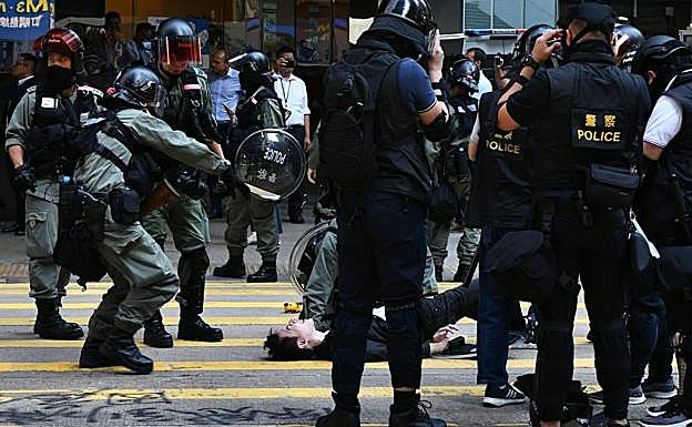 El peligro de que la violencia se incrementase en Hong Kong tras la primera muerte directamente imputable a las protestas se materializó este lunes. De hecho, la huelga general convocada para denunciar la brutalidad policial en la represión de las protestas que se alargan ya cinco meses comenzó con un dramático enfrentamiento poco después de las siete de la mañana: un policía que trataba de practicar arrestos se sintió acorralado por varios manifestantes y, aunque ninguno portaba armas u objetos contundentes, desenfundó su revólver reglamentario y, cuando creyó que trataban de arrebatárselo, disparó tres veces.