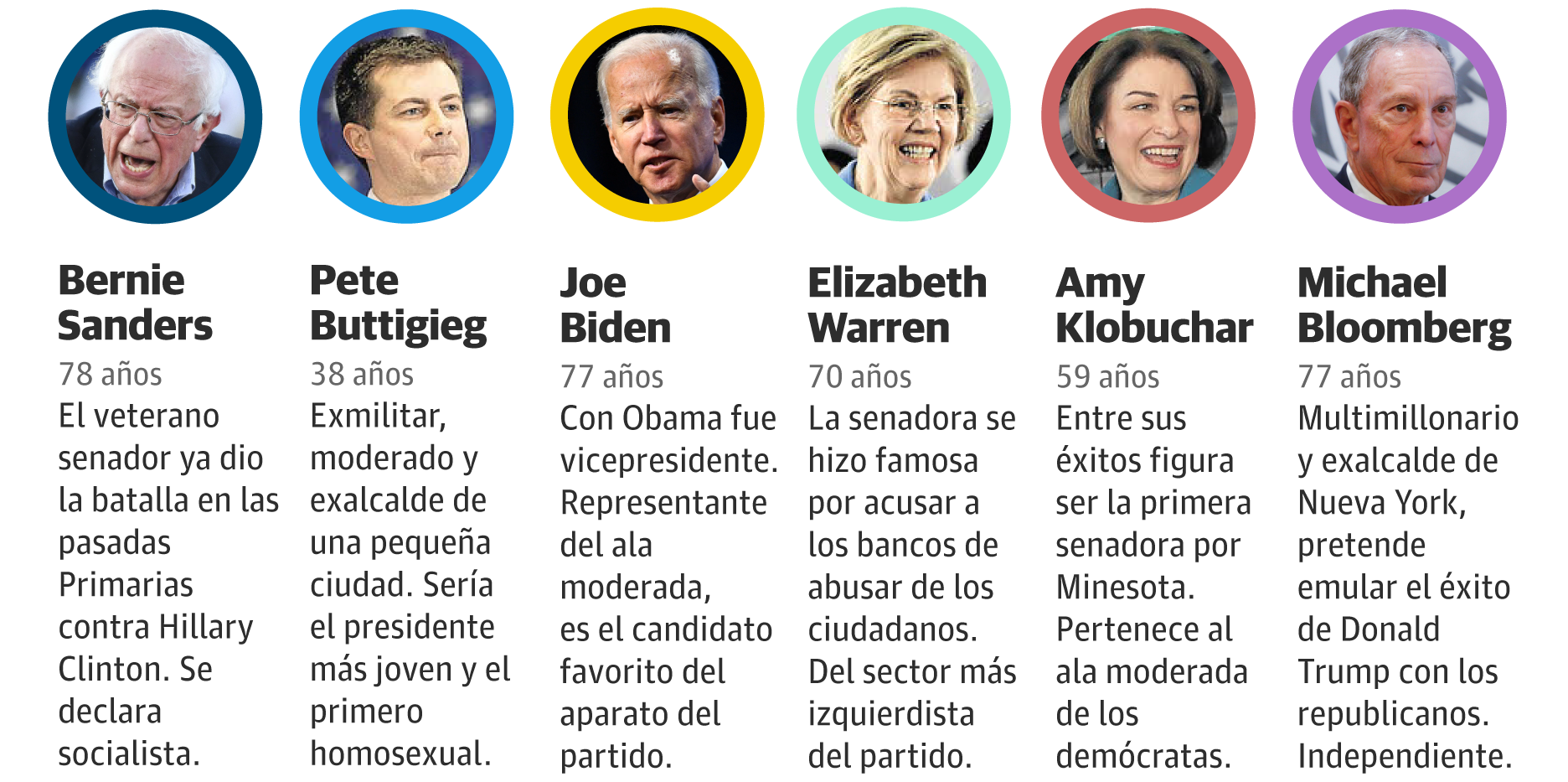 El ex alcalde neoyorquino también fue el único que se alineó abiertamente con las políticas pro israelíes de Trump al decir que no trasladaría la embajada estadounidense de vuelta Tel Aviv si ganase a presidencia, porque «lo que está hecho, ya está hecho». Bloomberg se vende como el único que tiene el dinero y la experiencia para gobernar el país, pero cada vez que lo hace resulta arrogante. Biden, por su parte, se presenta como el único que ya ha hecho lo que predica, dada su dilatada carrera en el poder, pero sus malos resultados en los tres estados que ya han decidido le deja pendiente de Carolina del Sur para sobrevivir.