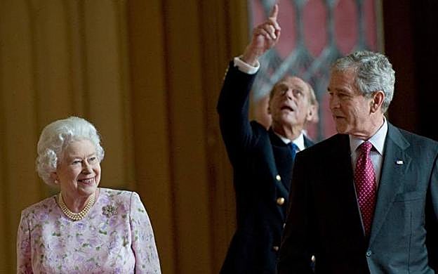 La Reina también conoció en 2008 al otro Bush que alcanzó la presidencia. La reina, junto al Duque de Edimburgo, y George W. Bush, en St. George's Hall en Windsor Castle, en Windsor, al oeste de Londres. Al fondo, el duque de Edimburgo.