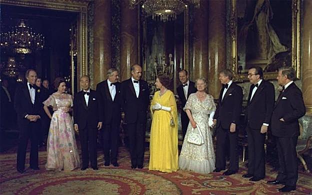 Biblioteca Presidencial Jimmy Carter La Reina Isabel II, junto al presidente de Estados Unidos, Jimmy Carter, en un encuentro con otros líderes internacionales en Londres el 13 de mayo de 1977. El encuentro dejó una anécdota curiosa, ya que Carter cometió el error de besar a la reina madre en los labios durante su visita al Palacio de Buckingham.