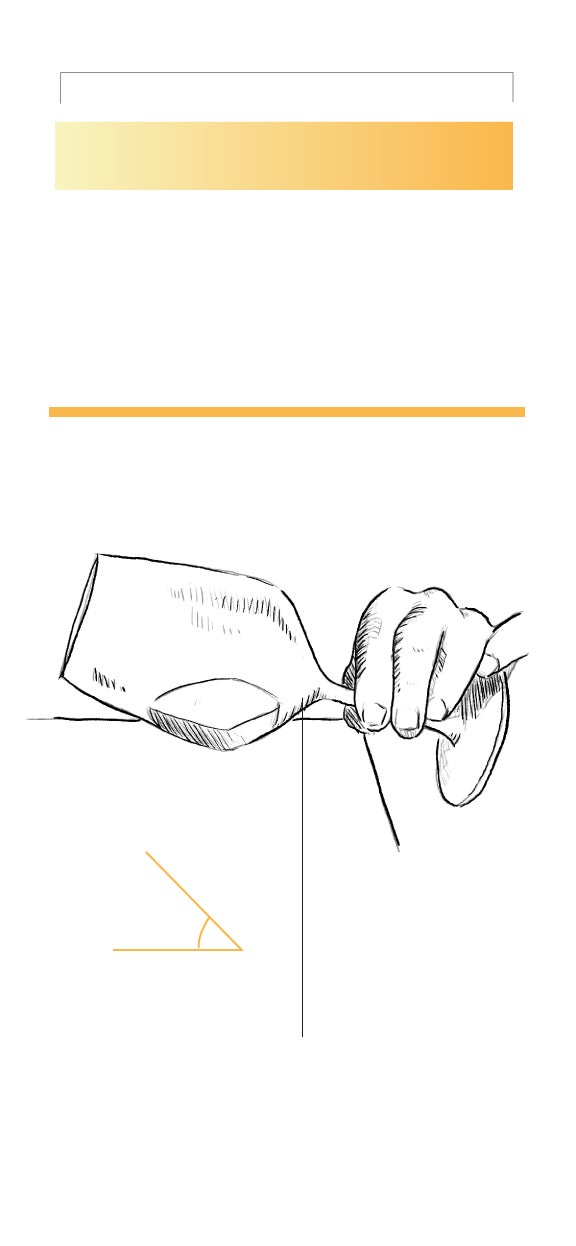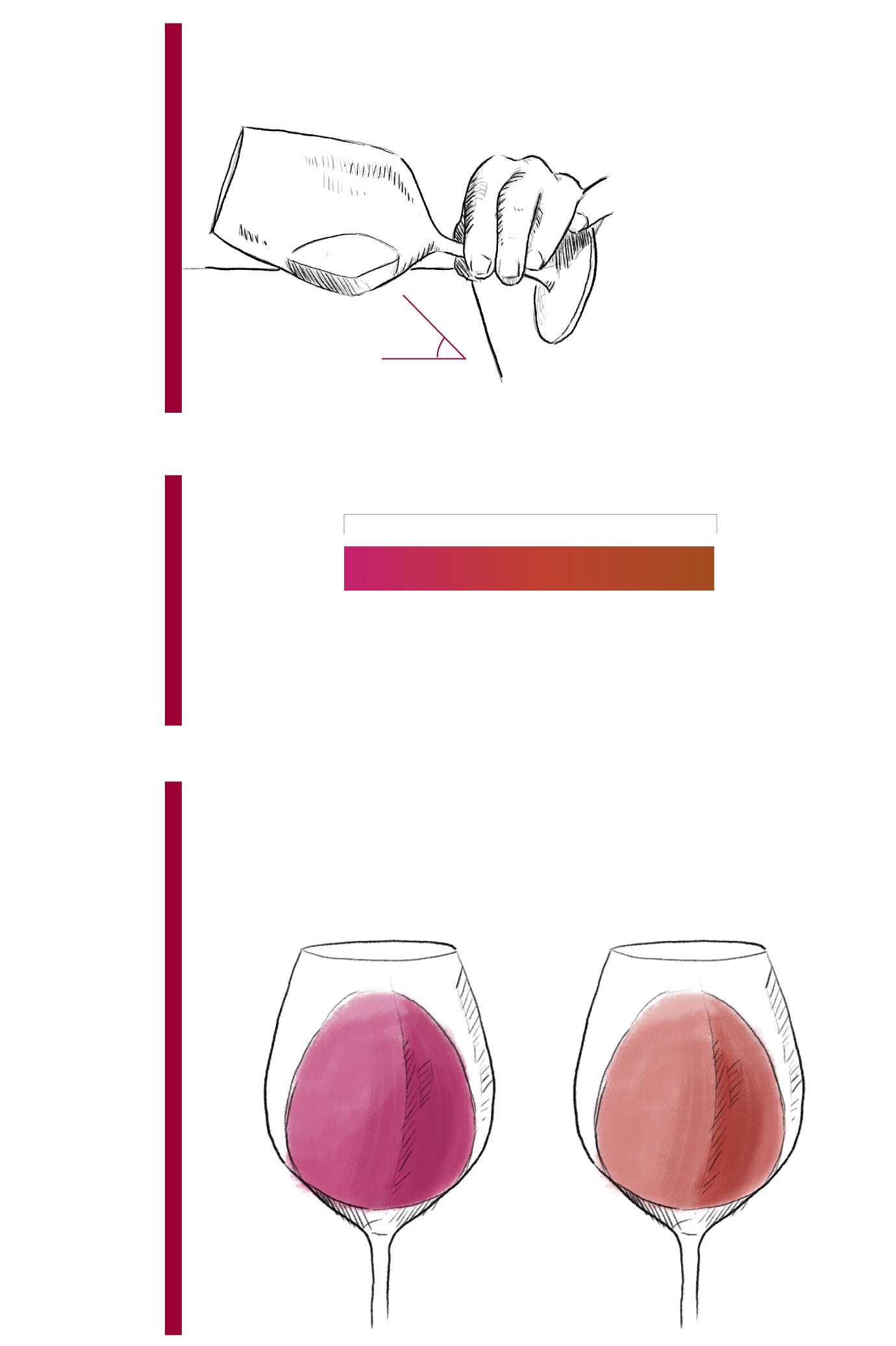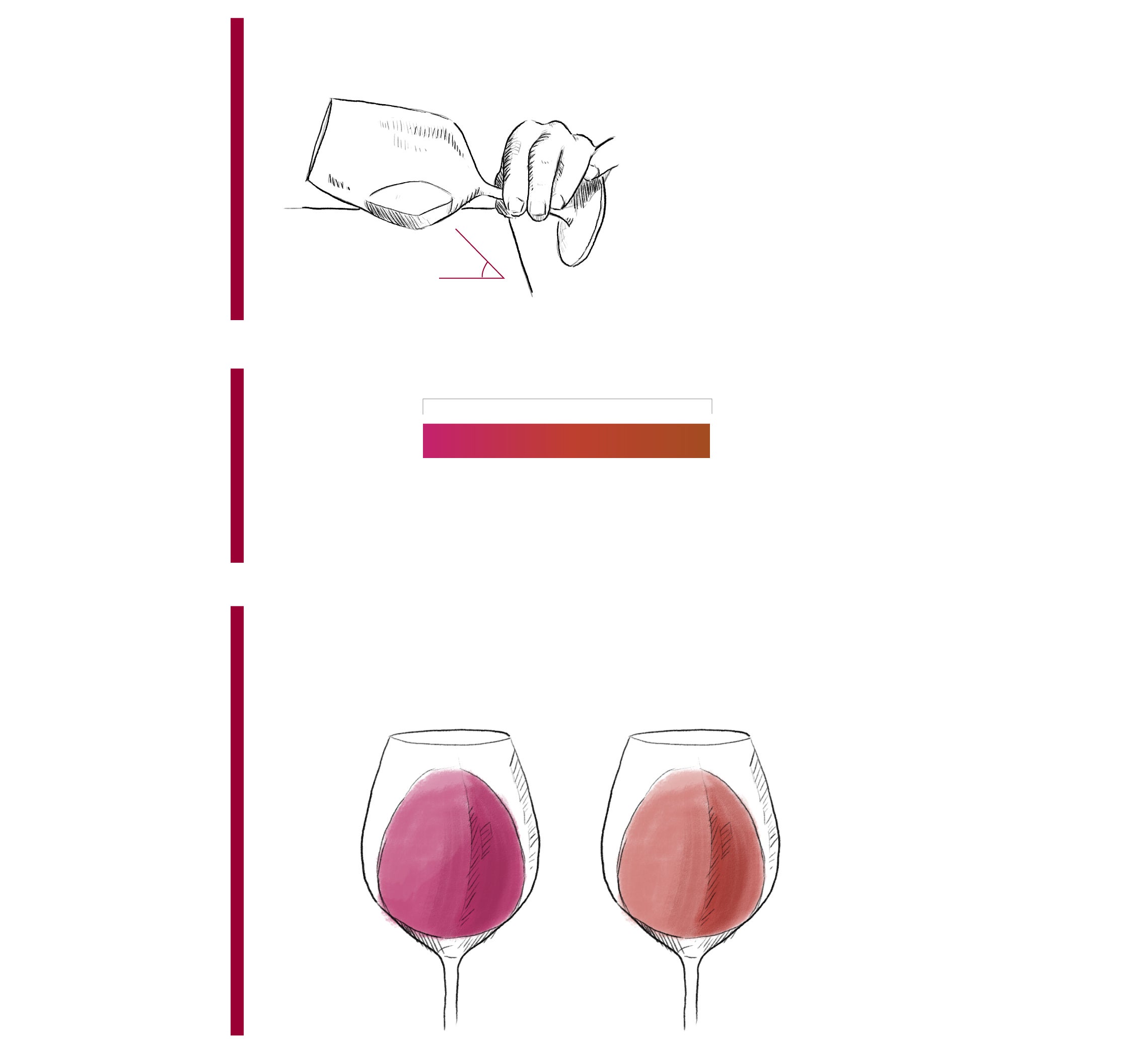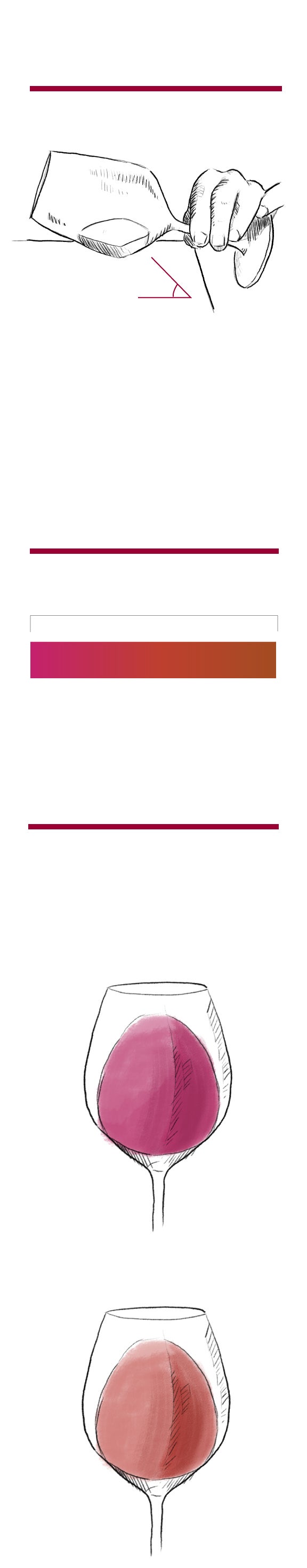 Bien. Ya tenemos la copa servida. No hay que llegar al borde; la medida ideal es un tercio. ¿Qué se hace a partir de ahora? Si toda primera impresión se define a través de la vista, los vinos no son una excepción. Así, se aconseja inclinar la copa 45º para empezar a apreciar los colores.