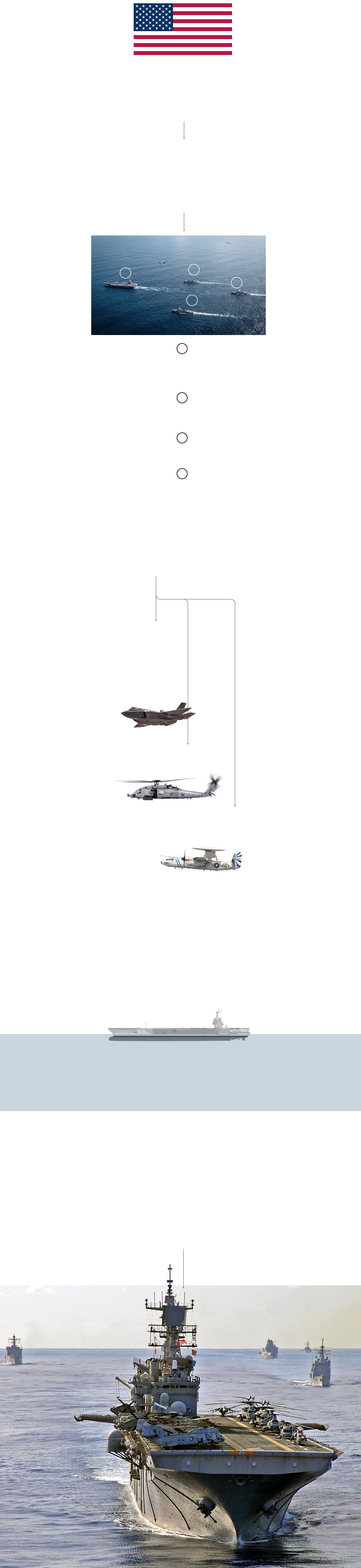 El primero es el portaaviones más grande y moderno de la Marina de Estados Unidos, un gigante de propulsión nuclear con capacidad para un máximo de 75 aeronaves que, ya por sí solas, superarían la capacidad de guerra aérea de Caracas. A bordo viajan los cazas más avanzados de la Fuerza Aérea, los F-35C, una versión específica para operaciones desde el portaaviones. Les acompañan helicópteros Sikorsky MH-60 Seahawk y todos ellos reciben soporte e información de los aviones de alerta temprana Grumman E-2D Hawkeye.