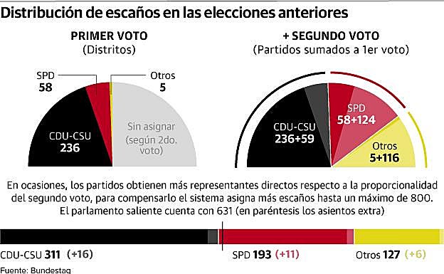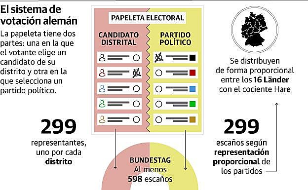 El Bundestag –equivalente al Congreso español- se compone de 598 asientos que son elegidos mediante un sistema de doble voto: