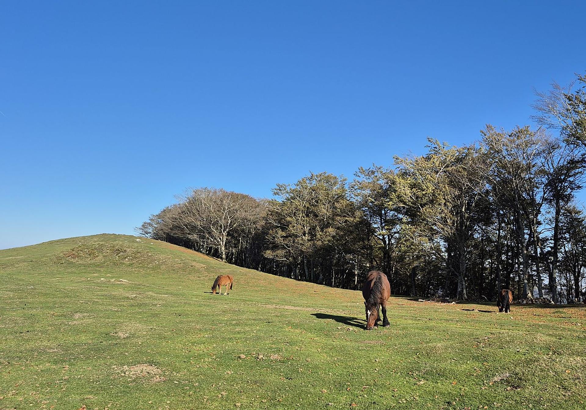 Tas superar la loma sobre el que se erige llegamos a la casa del sol desde donde las cistas son impresionantes. Un rebaño de ovejas disfruta de la paz del lugar. Nosotras decidimos emprender el descenso deshaciendo el camino que nos ha llevado hasta aquí. En lugar de regresar por nuestro camino inicial, optamos por dirigirnos hacia Baztarla (942 m.). No es difícil localizarla, ya que una gran antena sitúa a esta cima, donde tampoco hay buzón.