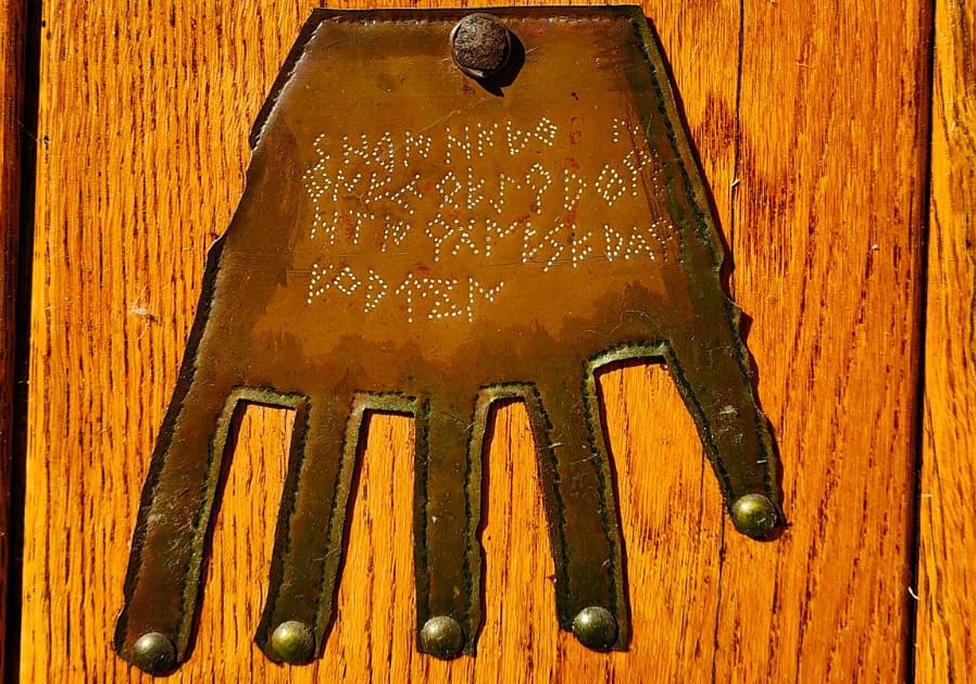 La representación en bronce, fue diseñada para colgar en la puerta de entrada de una casa, probablemente a modo de objeto ritual protector del hogar y en la actualidad son muchas las casas del valle de Aranguren y otros muchos puntos de Nafarroa en los que se puede ver una copia de aquella que fue diseñada hace unos 2.000 años.