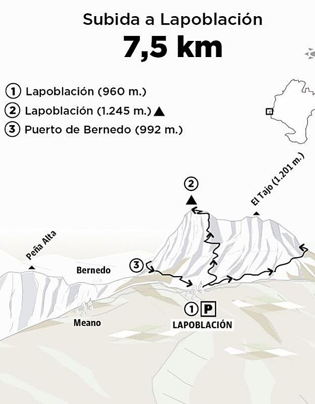Para afrontar la ascensión hay que coger una pista que nace detrás de la iglesia, gana altura suavemente al principio y dibuja dos amplios zigzag antes de convertirse en sendero y llegar a la base de los paredones, donde hay varias vías de escalada (0h.20'). La senda remonta hasta la cresta, aunque se aleja de ella para evitar sus dificultades y seguir ganando con comodidad. Más arriba vuelve a asomarse al precipio, justo en el punto de la arista en el que desemboca la senda que asciende por la pared norte desde el puerto de La Aldea. Un último repecho nos sitúa sin dificultades en la despejada cumbre (0h.40'), que ofrece amplias vistas de sierra Cantabria, Kodes, La Demanda y hasta Moncayo.De vuelta a Lapoblación, una excelente opción para completar la matinal es dar la vuelta a la montaña. El sendero está balizado (SL-NA. 165), pero no lo completaremos en su integridad. Partiendo desde la iglesia, solo seguiremos la marcas verdes y blancas hasta el cementerio. Allí, continuaremos por el camino de las flechas rojas (izq.), que circunda el León Dormido por un sendero más pegado a la peña y discurre por un bonito bosque de robles (vertiente sur) y hayas (norte) salpicado de boj. Cerca ya del alto de La Aldea, Bernedo o La Horca, que por los tres nombres es conocido, se reencuentra con el camino balizado para realizar juntos el tramo final de vuelta a Lapoblación (2h.30).