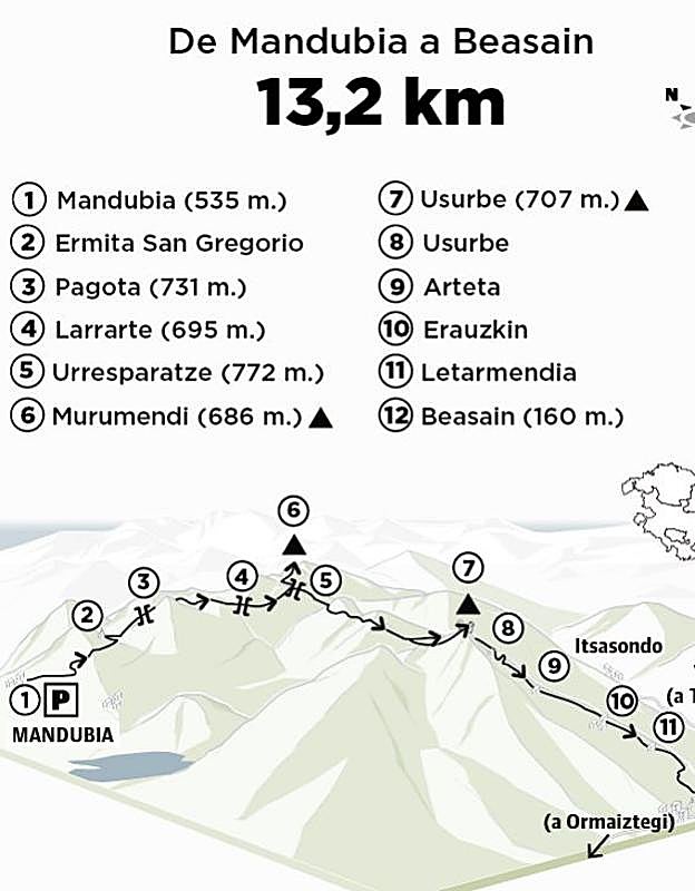 Casi todos los pueblos y municipios ha nacido al socaire de una montaña. Su vínculo, además, supera muchas veces lo geográfico para llegar a lo sentimental o religioso, como muestran las numerosas cruces que pueblan los montes vascos. En el caso de Beasain, la cumbre es Usurbe, que cierra por el sur el cordal de Murumendi y se convierte en un excelente mirador de Aralar, con Txindoki al frente.