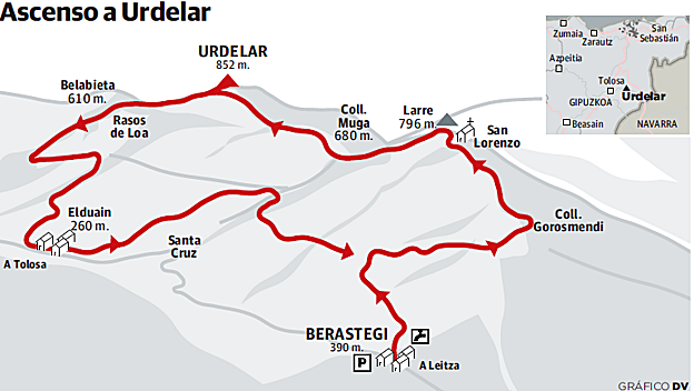 Urdelar (859 m.) es una de las cumbres que forman parte del cordal Uzturre-Ipuliño, que comienza en Tolosa con Uzturre (730 m.), y en el que se encuentran otras cimas como Larre (802 m.) e Ipuliño (930 m.), por encima del puerto de Gorosmendi (490 m.).Las principales alturas del cordal, enumeradas de oeste a este, son Uzturre, Urdelar, Larre e Ipuliño. Esta excursión propone ascender las dos centrales, con Berastegi como punto de partida. Desde Leitzaran, por el norte, y más concretamente desde Olloki, también es posible hacerlo, aunque a costa de una aproximación muy larga por un laberinto de pista.