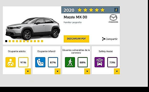 El primer eléctrico de la marca Mazda logra una puntuación del 91% en protección a ocupantes adultos, la más alta obtenida entre los vehículos testados en 2020. También logra el máximo en las pruebas generales de impacto frontal y lateral.