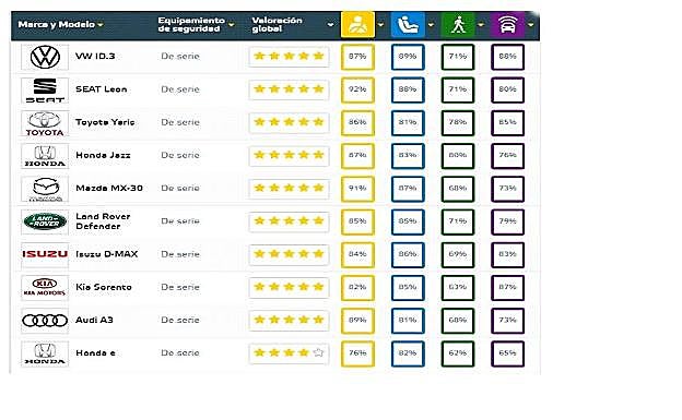 Este año los automóviles sometidos a las exigentes pruebas de impactodel organismo europeo Euro Ncap han experimentado nuevos ensayos como la barrera frontal móvil (MPDB) y el impacto en el lado opuesto. De los diez coches que obtuvieron la máxima puntuación con su configuración de seguridad estándar (es decir, sin extras), nueve lograron las cinco estrellas y uno cuatro, lo que refleja la dureza y exigencia de los ensayos.