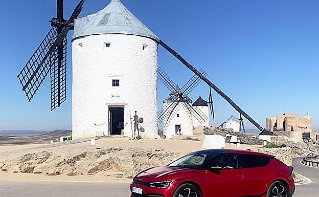 Nuestro Kia EV 6 es absolutamente ecológico, limpio, y respetuoso con el medio ambiente como, camino de Consuegra, lo son los Molinos de Viento que asoman por doquier y que hacen impresionante el paisaje; como ocurre con el empuje potente y constante del Kia, a lo que se añade una dirección de muy buena respuesta por su agilidad.