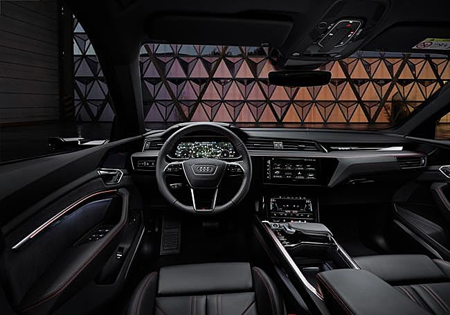 La imagen, con un diseño diferenciador para optimizar la aerodinámica, del Audi Q8 e-tron es deportiva y tecnológica a partes iguales, con una marcada ... musculatura gracias a su anchura de vías, y con rasgos muy característicos como sus faros o su parrilla frontal. La calandra protagoniza el frontal, de grandes dimensiones y con lamas ocluidas, para un mejor rendimiento aerodinámico. Unas ópticas delanteras de tecnología Digital Matrix LED, ahora cuentan con una línea de luz que recorre la parte inferior del capó de forma transversal. El Audi Q8 e-tron hace uso en la zaga de pilotos con tecnología OLED. Su interior minimalista, futurista y con materiales reciclados, cuenta con una instrumentación digital con pantalla de 12,3«, y una consola central con una pantalla del sistema superior de 'infotainment' con 10,1«, y otra inferior de la climatización con 8,8''.