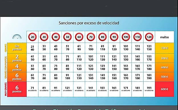 –Límite de 20 km/h: entre 21 y hasta 40 km/h la sanción será de 100 euros y no conlleva puntos; entre 41 y 50 habrá una sanción de 300 euros y 2 puntos; desde 51 hasta 60 son 400 euros y 4 puntos; entre 61 y 70 son 500 euros y seis puntos de carnet; si la velocidad supera los 71 km/h habrá una multa de 600 euros y 6 puntos.