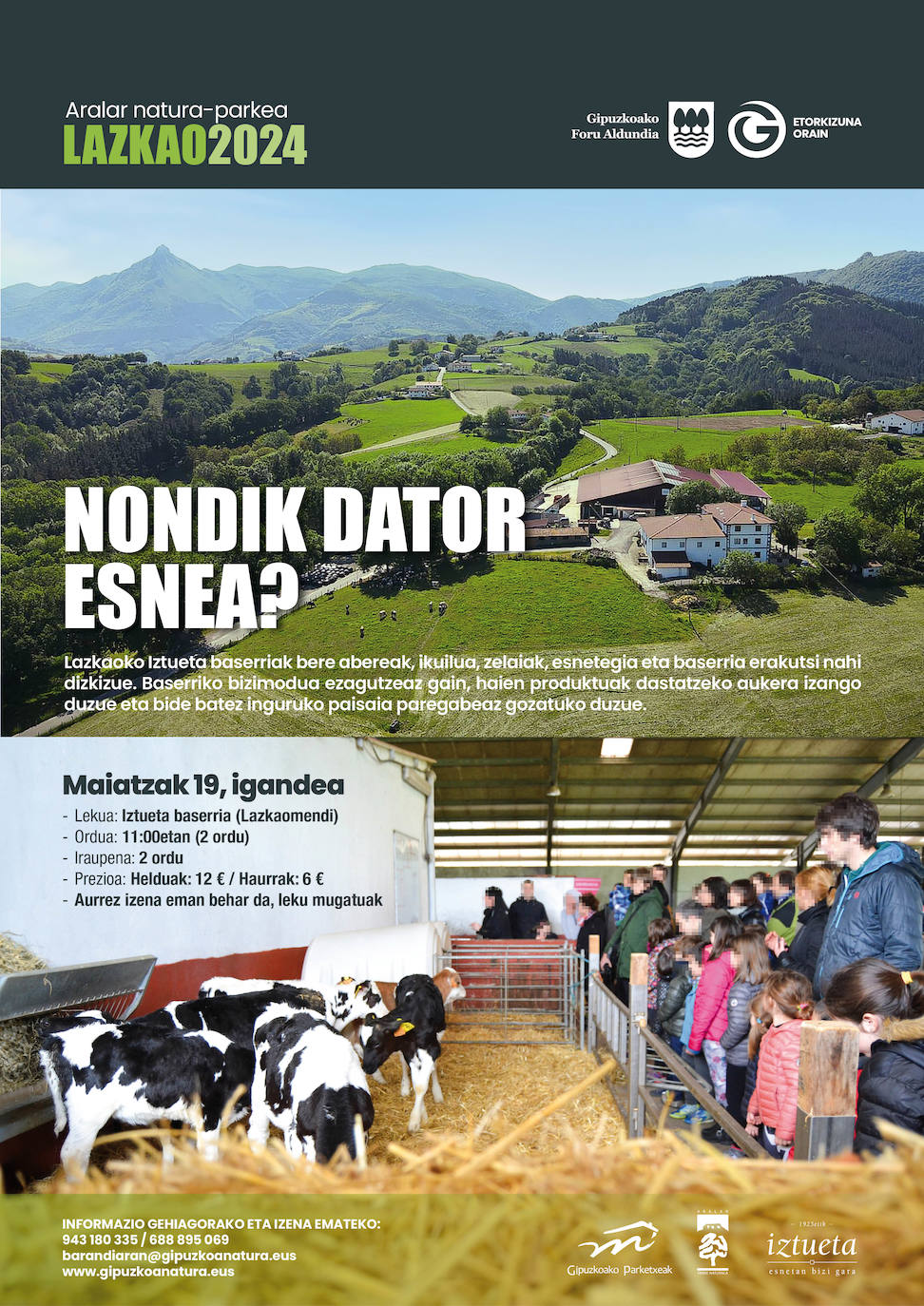 Para este domingo os proponemos pasar una buena mañana en familia en el caserío Iztueta situado en Lazkao. Los encargados del baserri mostrarán su ganado, cuadra, prados, lechería y caserío a todos los visitantes que acudan a la actividad. Además los visitantes podrán degustar los productos de gran calidad que producen, adentrarse en el modo de vida del caserío y, de paso, disfrutar de un paisaje único en la zona.