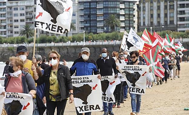 «No necesitamos un mapa, pero, siguiendo el camino que nos han mostrado las flechas, es el momento de ir haciendo realidad el 'Etxera bidea gertu'», han expresado el bertsolari Xabier Euzkitze y la actriz y cantante Iholdi Beristain, que han dado lectura a un comunicado en euskera y castellano en un acto que ha tenido como escenario el Parque Tecnológico de Miramon en San Sebastián. Ambos colectivos consideran que, a partir de ahora, con la práctica totalidad de los presos de la banda ya en cárceles vascas, se entra en un nuevo ciclo y «eso requiere un cambio de diseño, de imagen». «Ya no es precisa la idea del mapa porque todos los presos están en Euskal Herria», explican. Ante la nueva situación penitenciaria derivada del fin de la dispersión Etxerat y Sare pretenden «dar prioridad al proceso de vuelta a casa» y por ello, consideran «importante también cambiar el diseño que durante tantos años se ha utilizado para reivindicar su vuelta a Euskal Herria», exponen.