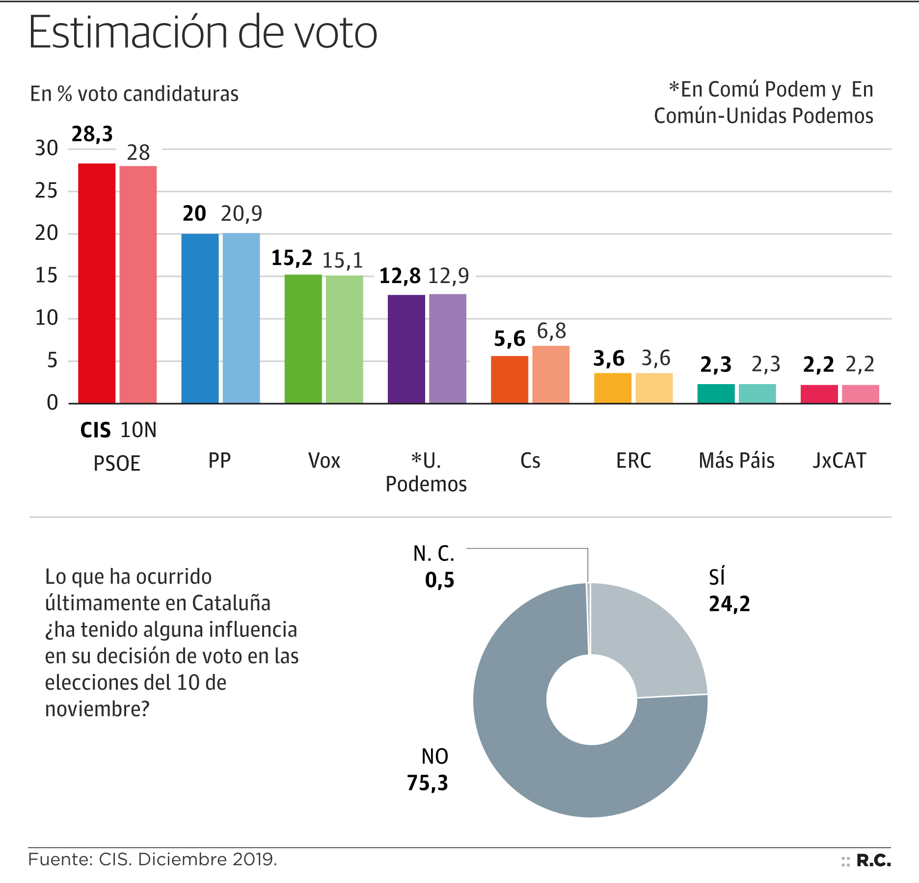En concordancia con esa falta de arrepentimiento generalizado, la estimación de voto del CIS para unas hipotéticas elecciones que se hubieran celebrado en diciembre no dista mucho de las cifras del 10-N. Los porcentajes de voto se mantienen prácticamente iguales con la única excepción del correspondiente a Cs que, no obstante, sólo bajaría un punto, del 6,8% al 5,6%.