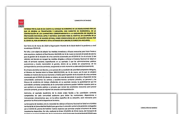 Ese 20 de mayo el consejero de Sanidad, Enrique Ruiz Escudero, «dio cuenta» al Consejo de Gobierno de la comunidad de Madrid, que preside la propia Ayuso, de cinco «resoluciones» por las que se «ordenaba la tramitación y ejecución» con «carácter de emergencias» de la adquisición de diverso material sanitario «para el hospital de campaña de la institución ferial de Madrid, Ifema».