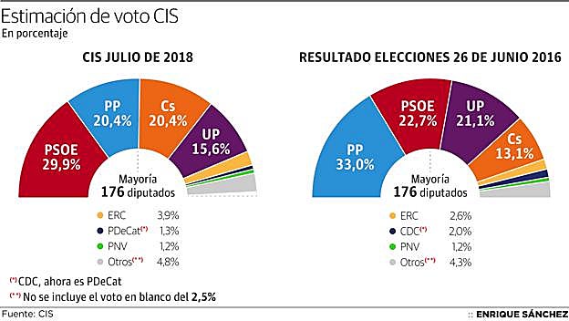 El sondeo, realizado entre el 1 y el 10 de julio, es el primero elaborado tras la moción de censura que expulsó a Mariano Rajoy y a su partido del poder pero no recoge aún el efecto que haya podido tener sobre los votantes la designación de Pablo Casado como nuevo presidente del PP el pasado día 21. En todo caso, indica un desgaste tanto de esa formación, que pierde casi cuatro puntos respecto a hace tres meses y de la fuerza política que lidera Albert Rivera, que cae dos puntos.